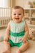 Make your baby girl shine with our Mint Polka Pearl Baby Set! This adorable romper features a sleeveless mint green and white polka dot top with a built-in peplum and a chic emerald waistband adorned with pearls and a stylish...